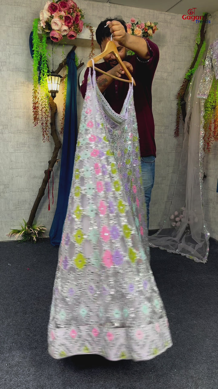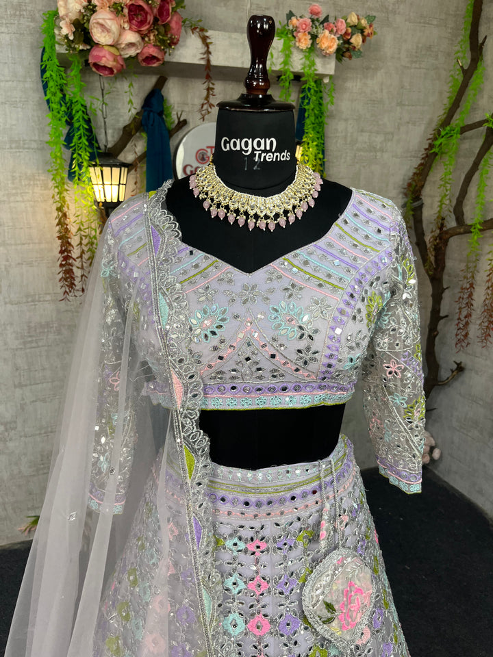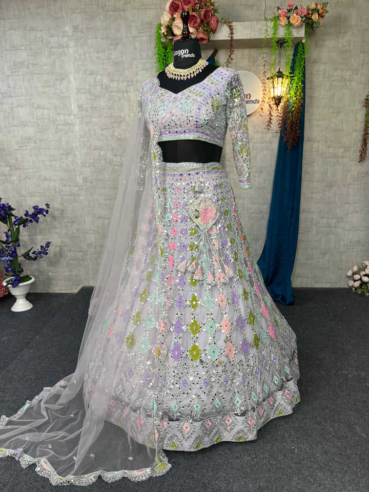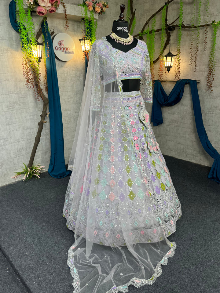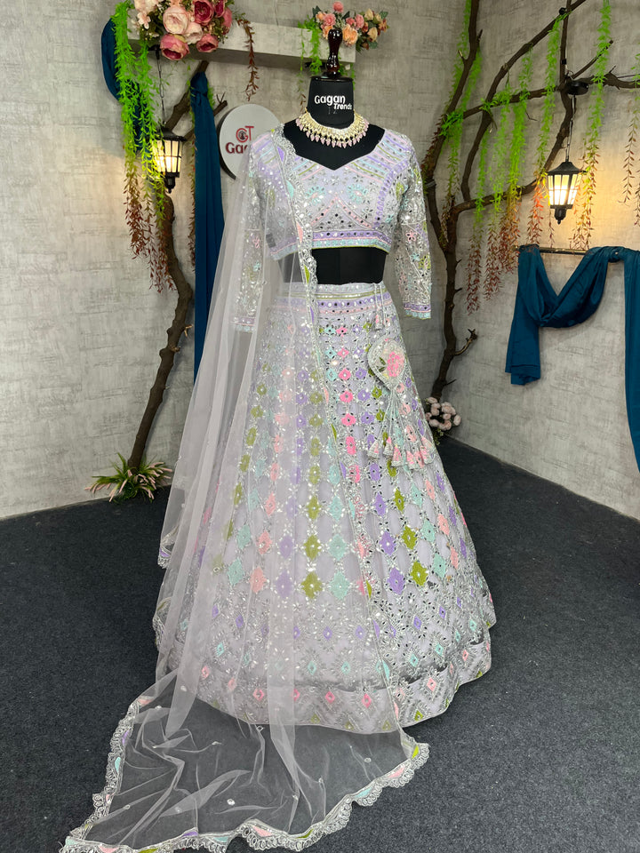 Butterfly Net Mirror Work Lehenga with Sequins Embroidery for Wedding & Festive Looks