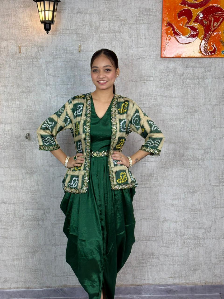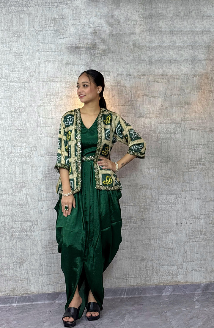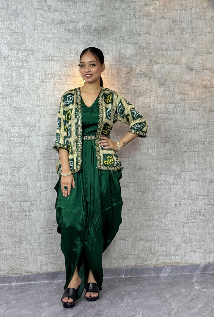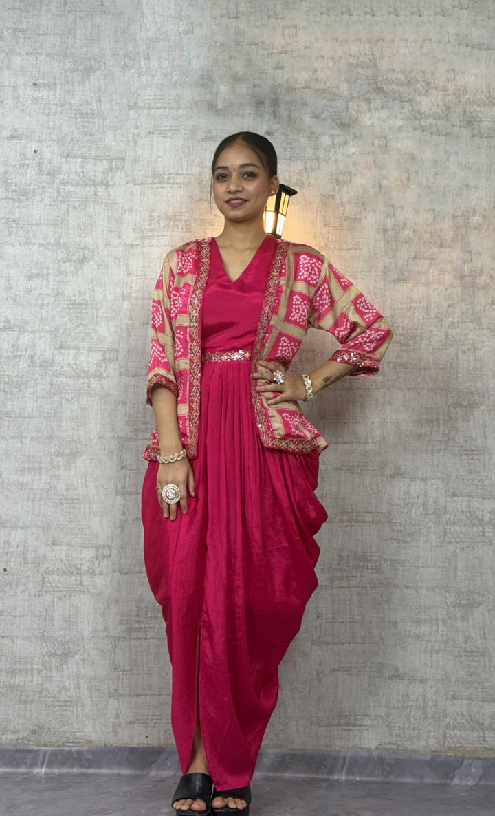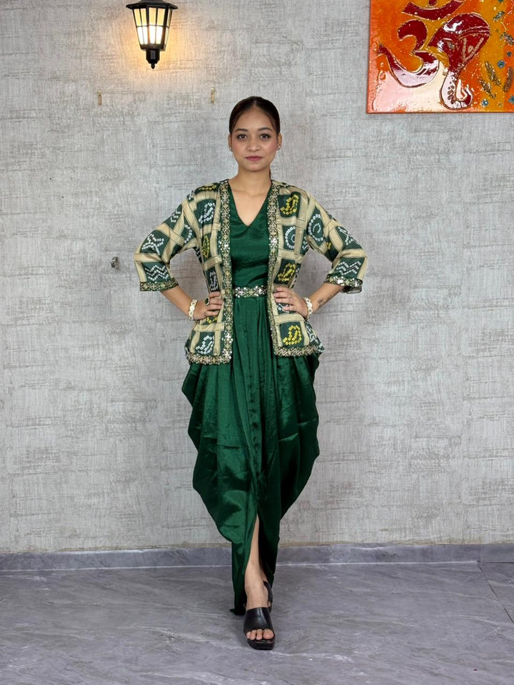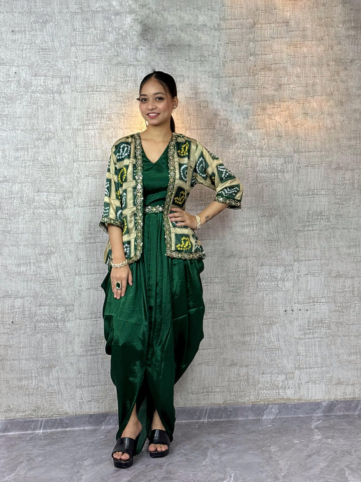 Chic Chinon Silk Dhoti Style Dress with Digital Print & Sequins Embroidered Jacket