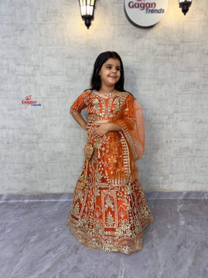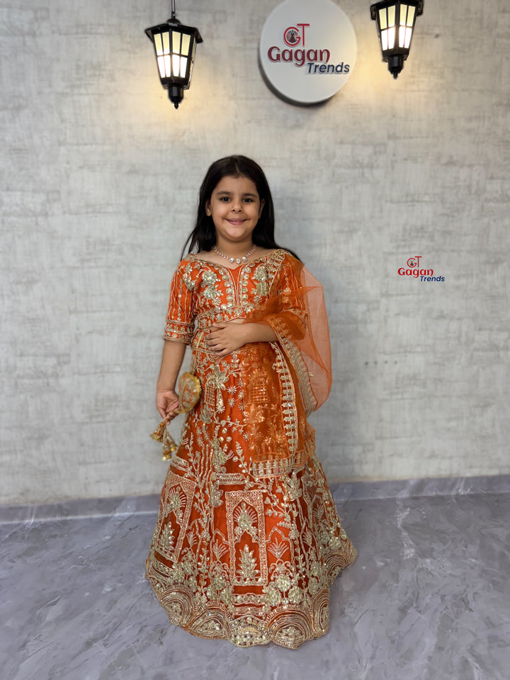 🧡 Girls Orange Soft Net Lehenga Choli with Coding Sequins – Fully Stitched Traditional Dress (0–18 Years)